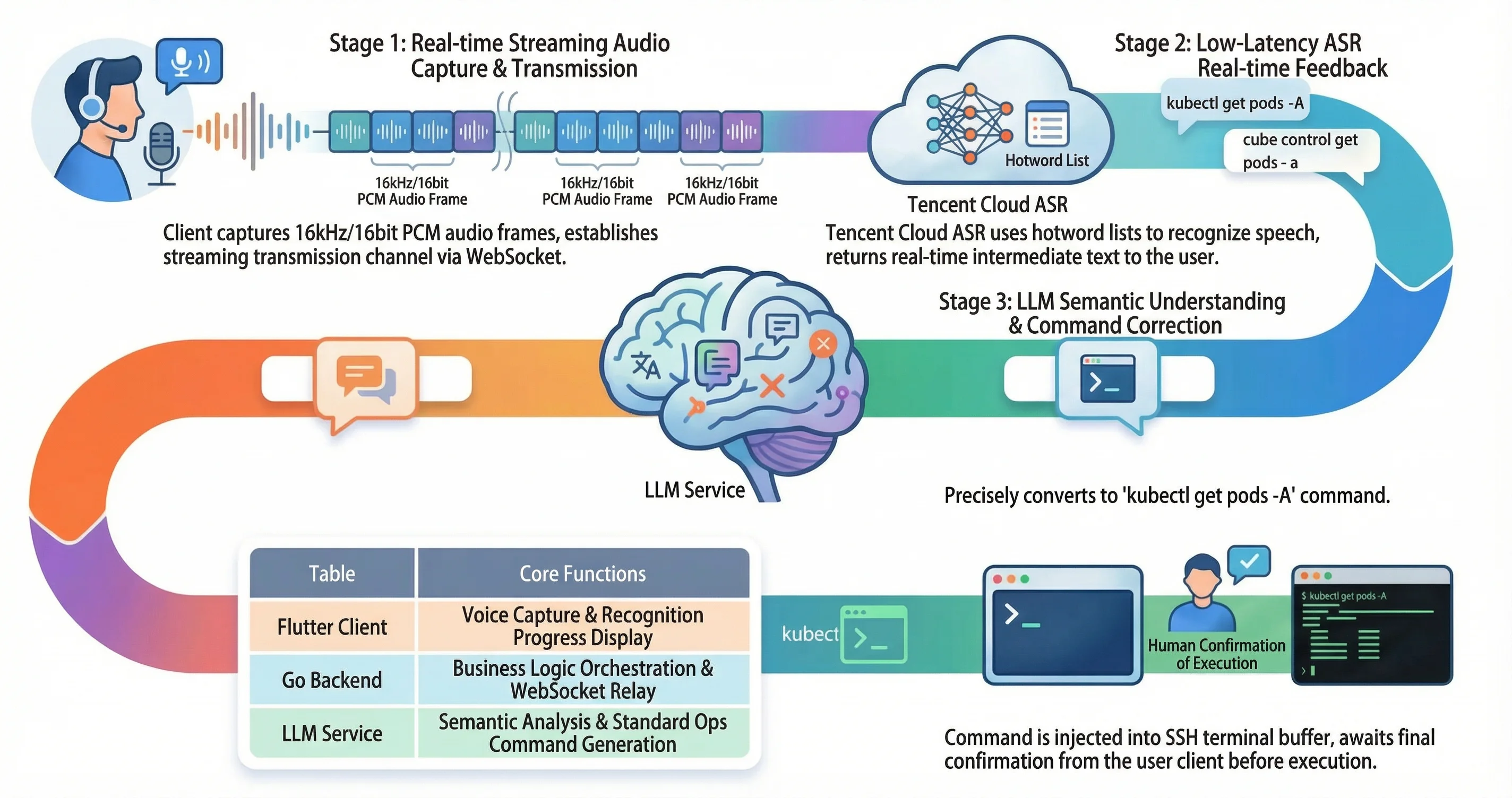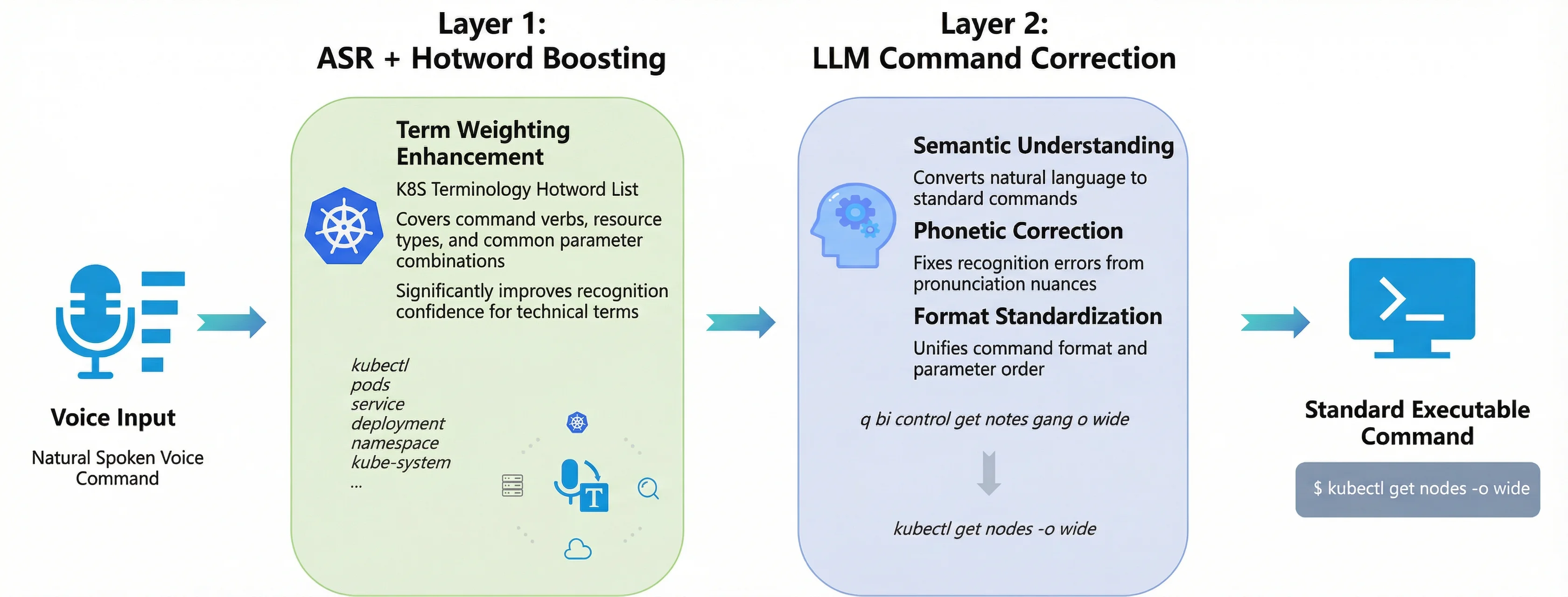 The Role of the LLM Layer: As a semantic understanding layer, it converts the raw output of ASR (natural language, homophones, incomplete commands) into standard, executable Kubernetes commands.