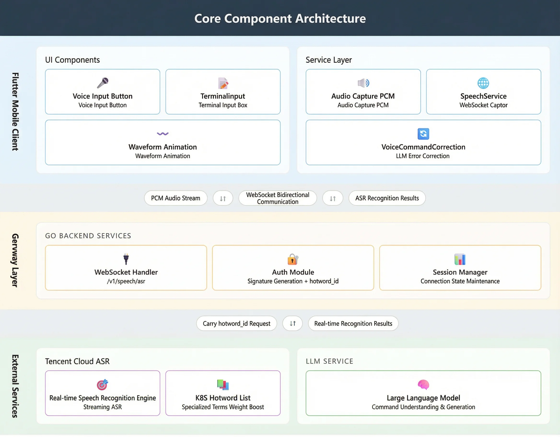 Flutter Mobile App: The architecture is divided into two main modules: User Interface (UI) components and Service Layer. At the UI level, the VoiceInputButton component provides a voice input interface and uses WaveAnimation to provide real-time feedback on the user's operation status. At the service layer, AudioStreamService handles the acquisition of PCM format audio streams, while SpeechService encapsulates the data transmission logic based on the WebSocket protocol. Meanwhile, the VoiceCommandCorrection module encapsulates a carefully designed Prompt, enabling the use of a Large Language Model (LLM) to correct voice commands.