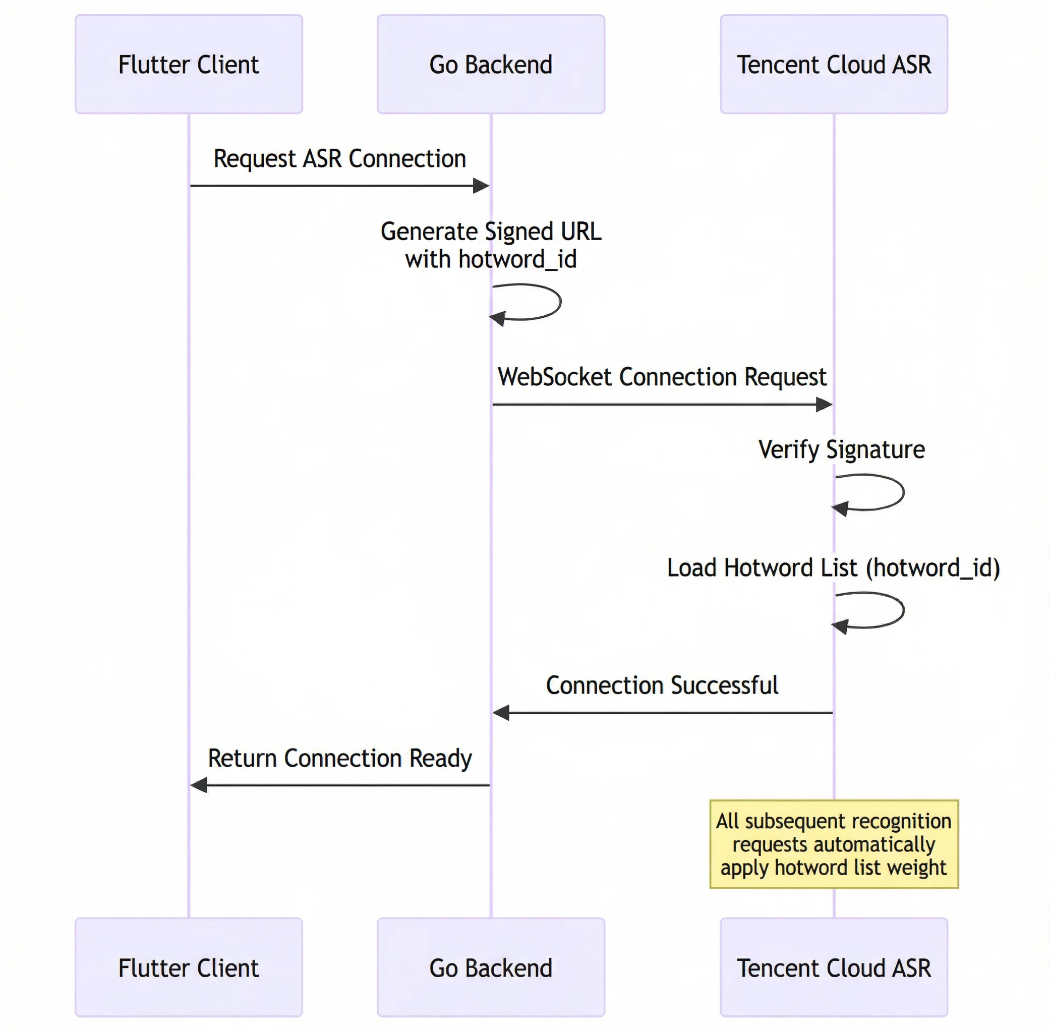 Gateway Layer: The backend services are built using Go. Its core components include a WebSocket handler and an authentication module. Specifically, during connection establishment, a parameter named hotword_id is appended, allowing the Automatic Speech Recognition (ASR) system to load a corresponding hotword list, achieving a "one-time handshake, end-to-end optimization" effect.