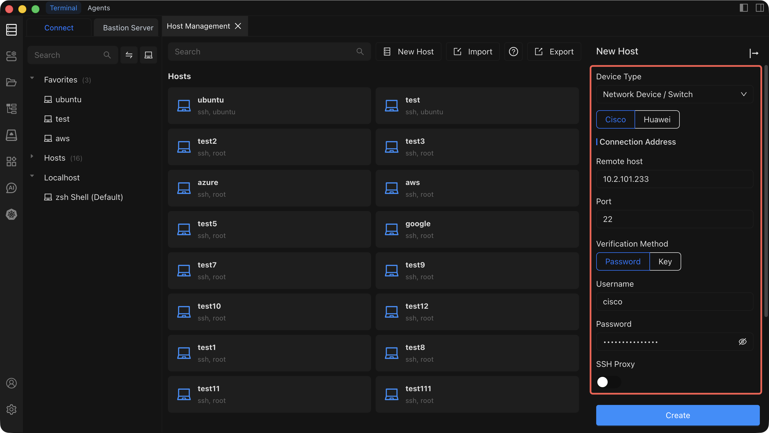 | SSH proxy | If the network device is on an isolated management VLAN or behind a firewall, configure an SSH proxy to route the connection through an intermediate server. Leave empty for direct connections. | No |