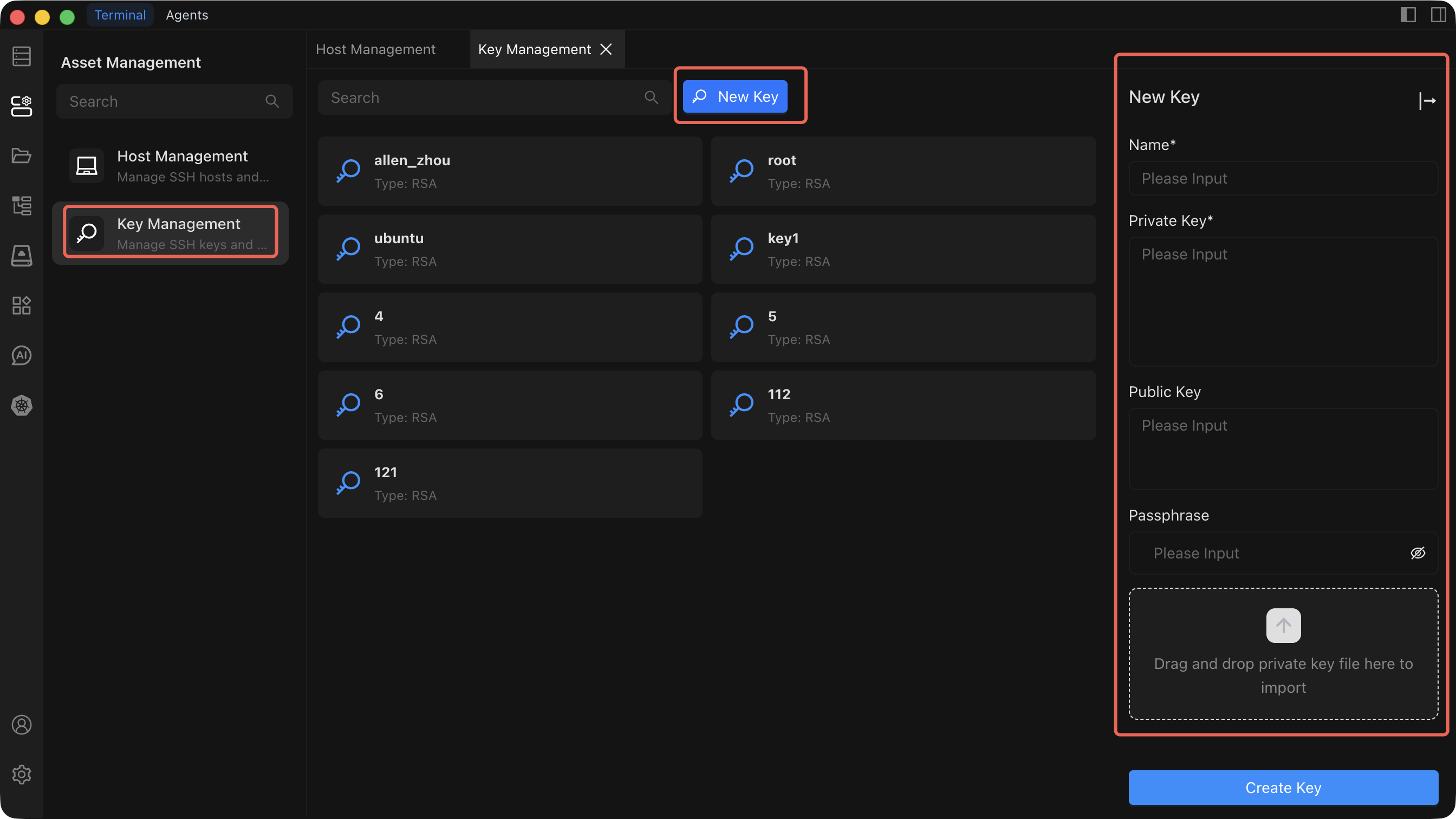 If you choose key authentication, you must first add your private key here so Chaterm can use it during connection.