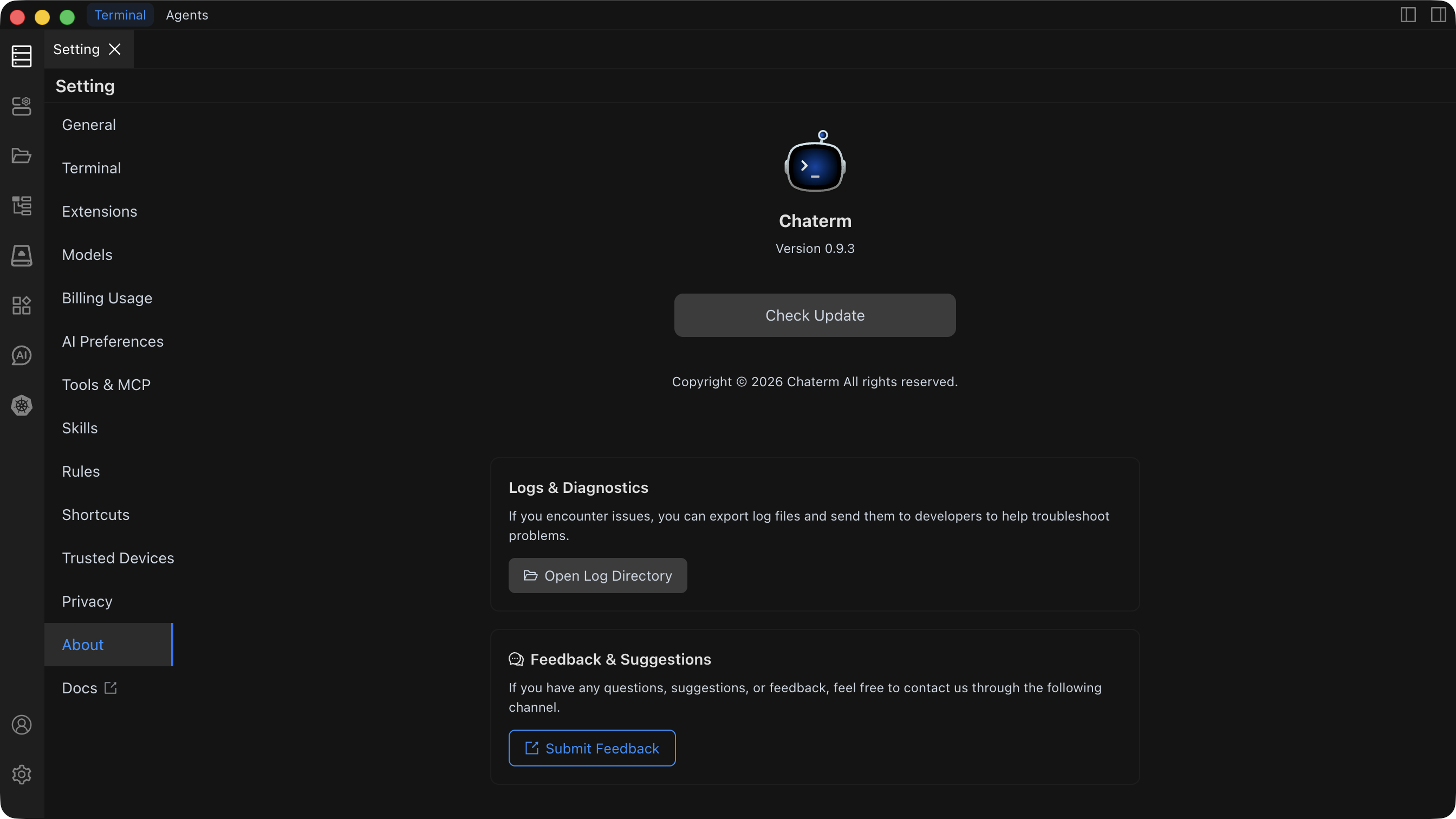 On the About page, you can view the currently installed Chaterm version number. The version number is typically displayed at the top of the page in the format vX.X.X (e.g., v1.0.0).