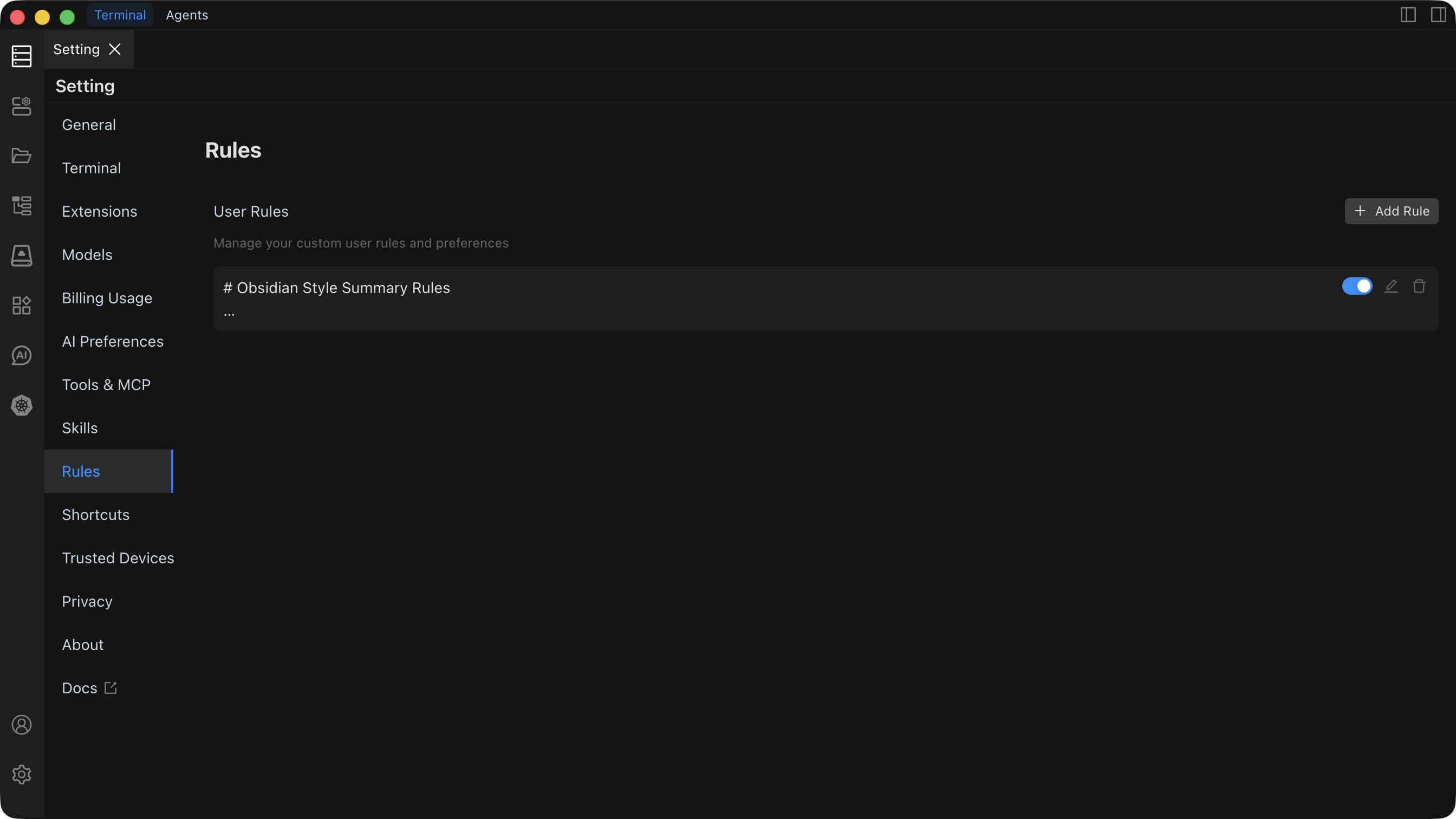 The Rules feature manages your custom user rules and preferences, enhancing Chaterm's intelligence and work efficiency. By configuring personalized rules, you can customize the AI assistant's behavior patterns to better match your work habits and needs.