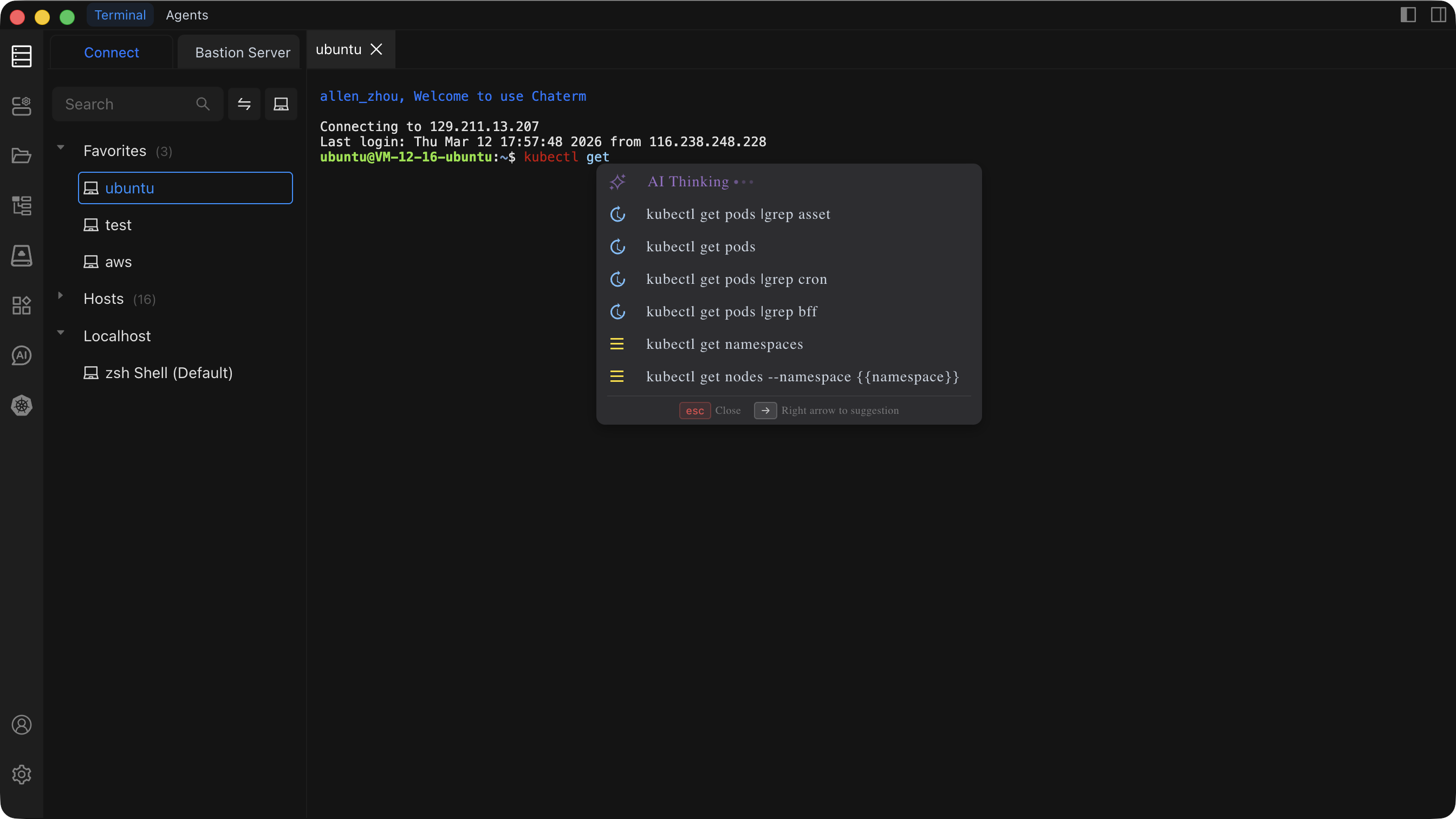 Chaterm suggests commands as you type in the terminal, helping you work faster and reducing typos by drawing from your history, a built-in command library, and optional AI suggestions.